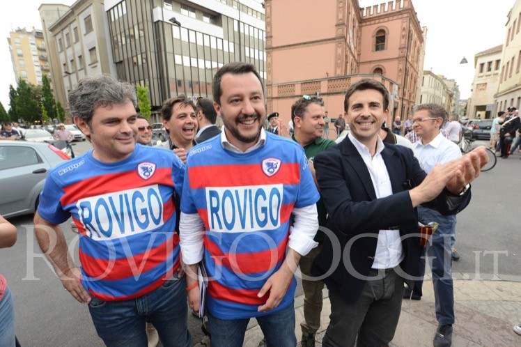 La cosa che invece mi ha davvero disturbato della cosa è vedere stamattina le foto del comizio, scoprendo con sorpresa che Salvini indossava una maglia della Rugby Rovigo Delta, anzi non una maglia, ma una t-shirt ufficiale, con tanto di logo del nostro Club e sponsor tecnico, giusto per non sbagliarsi.